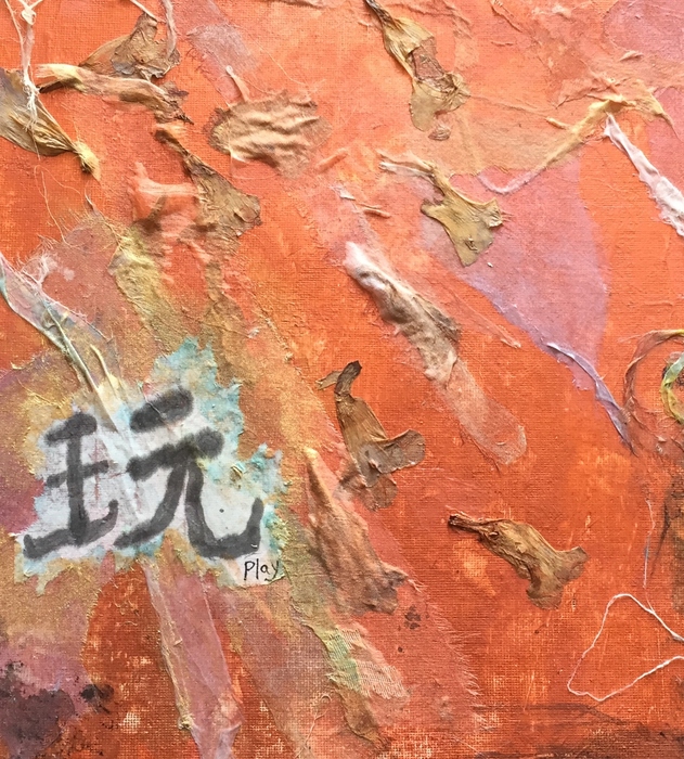 12" x 12." Mixed Media: acrylic, ink, fabric, paper, dried pigment, pearl.